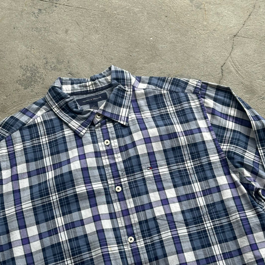 Tommy Hilfiger Blue, Purple and White Plaid Long Sleeved Button Up